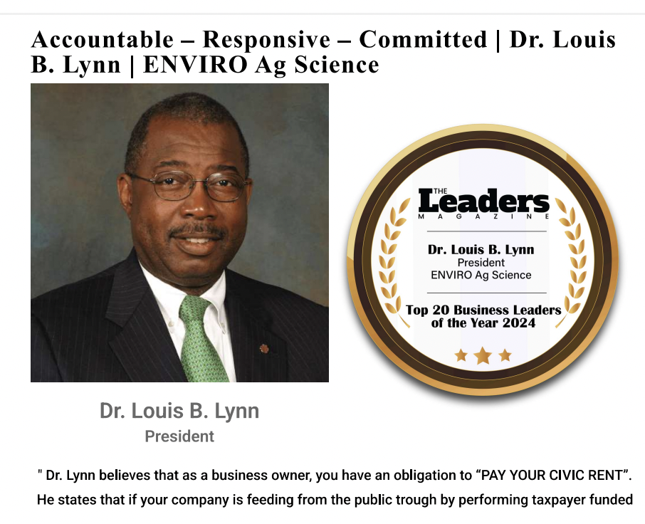 In the 2024 edition of The Leaders Magazine, Dr. Louis B. Lynn and ENVIRO AgScience, Inc. are honored as one of the Top 20 Most Innovative Businesses of the Year.
