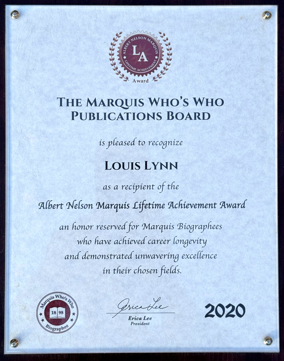 Louis B. Lynn is a 2020 Recipient of the Albert Nelson Marquis Lifetime Achievement Award.
